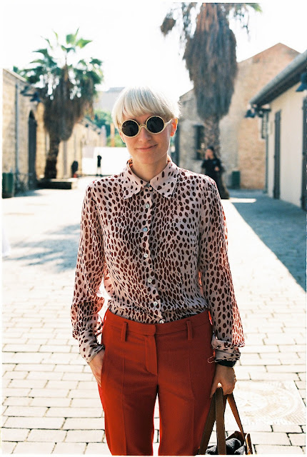 Aj keby ste mi hrozili ružovou vodnou pištolou pri hlave, by som sa nevedela rozhodnúť komu sa červená farba hodí viac: blondýnkam či brunetkám (viď post nižšie). Každopádne, tento outfit má všetko: červenú pre farbičky, vzor pre exotiku, volániky na spodku nohavíc pre dievčenskú milosť, zostrih pre chlapčenskú drzosť, zapnutý golierik pre slušnosť, Chanel botky pre štýl, telové slnečné okuliare pre zaujímavosť a palce hore pre schopnosť to zmixovať. Tak takto sa to robí vo Fínsku :-)